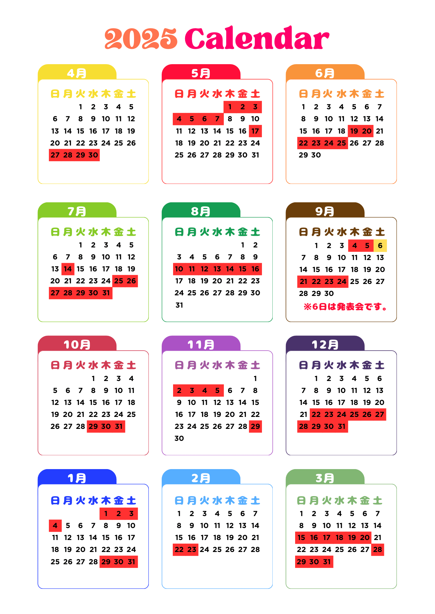 2025年度のレッスンカレンダーを修正いたしました(2025/05/09)